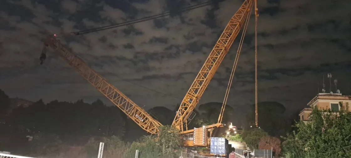 È arrivata in cantiere, durante il weekend appena passato, la gru destinata a sollevare e posizionare l’impalcato del nuovo ponte Giulio Rocco, tra Ostiense e Garbatella. Si tratta di un macchinario imponente: 53 metri di altezza e una portata di 700 tonnellate, dimensioni che le permetteranno di manovrare la carpenteria metallica già preassemblata sul posto.