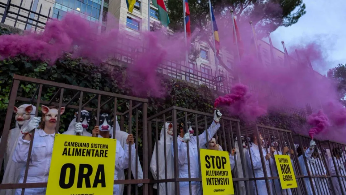 Grandi gabbie con attiviste e attivisti di Greenpeace mascherati da mucche e maiali hanno accolto i delegati questa mattina davanti alla sede della Fao a Roma. È l’apertura della seconda Conferenza mondiale sulla trasformazione sostenibile dell’allevamento delle Nazioni Unite, segnata da un flash mob colorato di fumo rosa, simbolo delle emissioni di metano prodotte dal settore zootecnico. Sui cartelli le scritte: «Fattorie, non gabbie», «Stop allevamenti intensivi» e «Cambiamo sistema alimentare, ora!».