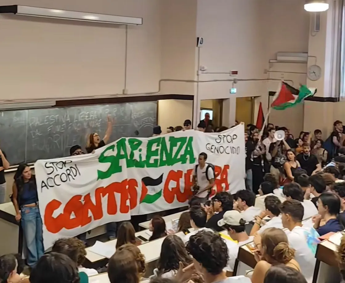 Sirene che riecheggiano nei corridoi, tamburi che battono il ritmo della protesta, bandiere palestinesi sollevate tra le aule universitarie. Alla Sapienza è partito nel pomeriggio un corteo pro-Gaza organizzato dai collettivi studenteschi Cambiare Rotta, Osa e Udu, con partenza dalla Facoltà di Lettere e un percorso che ha attraversato diversi edifici dell’ateneo.