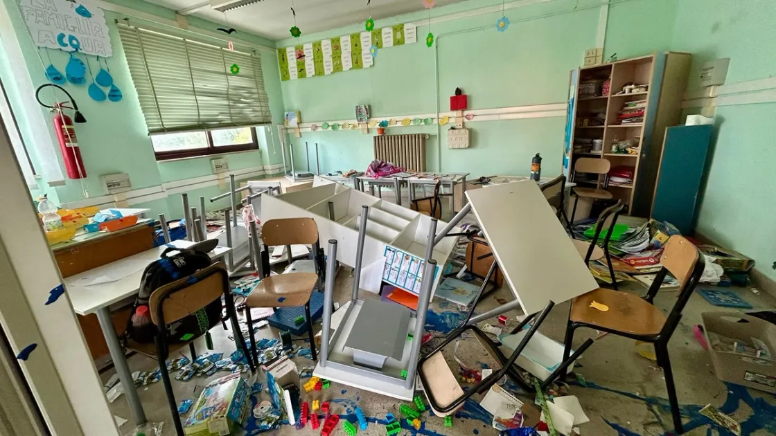 Sedie, banchi e arredi distrutti, estintori rotti e lasciati a terra, vernice ovunque, quadermi, libri e giochi rovinati: un intero piano dell'istituto scolastico di via Baccano 10 a Labaro - dove ci sono le classi delle elementari - è stato devastato.