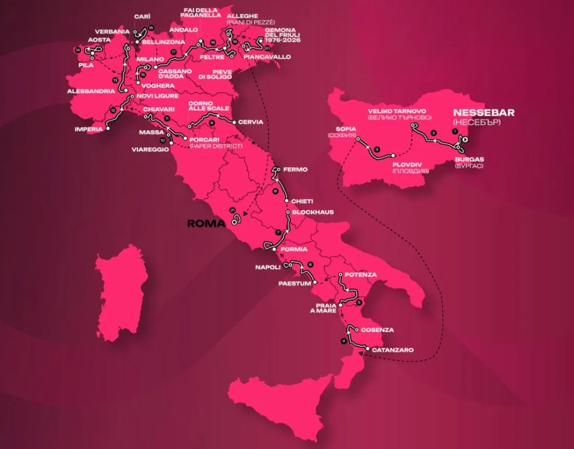 La 109esima edizione del Giro d’Italia prenderà il via venerdì 8 maggio dalla Bulgaria, per concludersi domenica 31 maggio a Roma, coprendo complessivamente 3.459 chilometri e un dislivello totale di 49.150 metri. Il percorso prevede 21 tappe, di cui 3 all’estero, con una cronometro individuale pianeggiante di 40,2 chilometri, 8 tappe di pianura, 7 di media montagna e 5 di alta montagna, con 7 arrivi in salita. La Cima Coppi, punto più alto della corsa, sarà il Passo Giau a 2.233 metri.
