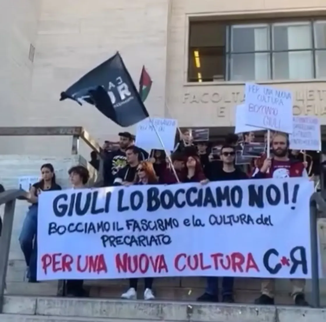 «Per una nuova cultura... Bocciamo Giuli! Bocciamo il fascismo e la cultura del precariato», era lo slogan della mobilitazione di «Cambiare Rotta», collettivo della Sapienza che aveva annunciato la protesta di questa mattina, in occasione dell'ultimo esame del neo ministro della Cultura Alessandro Giuli. Gli studenti del collettivo, nonostante l'esame di Giuli sia finito, sono sulle scale davanti alla sede della facoltà di Lettere e Filosofia in presidio.