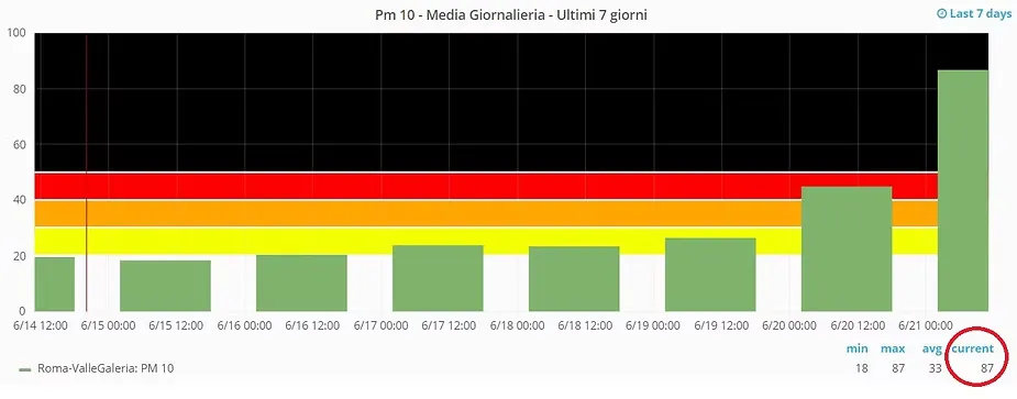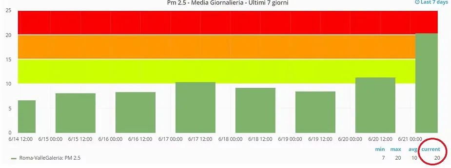 Nei livelli di particolato PM 2.5 la media giornaliera non è regolamentata dalla legge italiana, mentre l'Oms (Organizzazione Mondiale della Sanità) stabilisce, come soglia di sicurezza, una media giornaliera di 25 μm/m3. Ieri sera la centralina ha registrato una livello di ben 20 μm/m3.