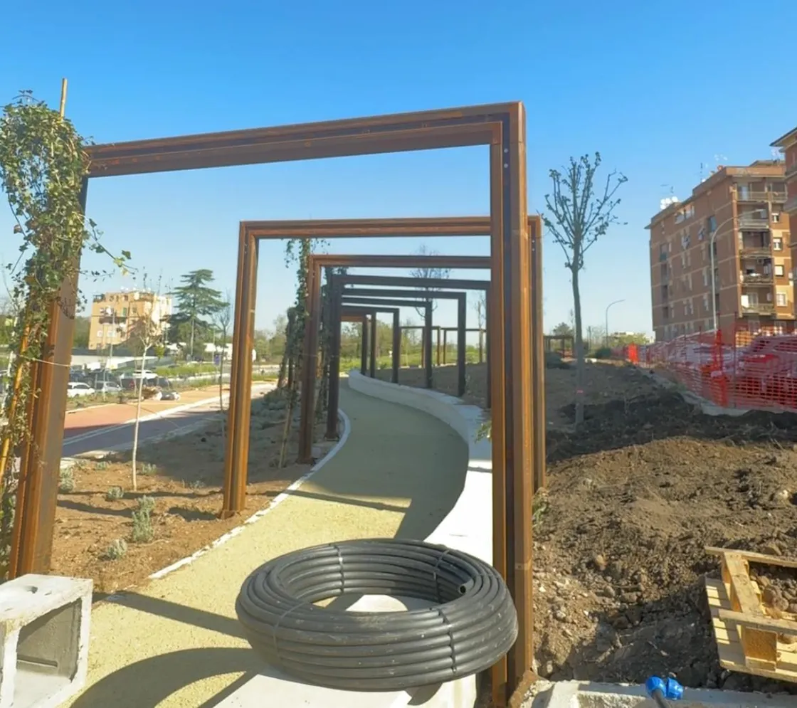 Un’ampia zolla di terra, dotata di un sistema di irrigazione, accoglierà, invece, 150 alberi mentre le piante di salvia, rosmarino e liquirizia saranno 2500 in tutta l’area. 35 portali, accanto alla futura area fitness con gli attrezzi ginnici, verranno ricoperti di edera per realizzare un sentiero pedonale ombreggiato. Lateralmente è già pronta la pista ciclabile che condurrà a via dei Durantini. Il progetto prevede anche l’ultimazione di due rotonde: nella prima sarà installato il totem del IV municipio e nell’altra sarà piantato un uliveto.
