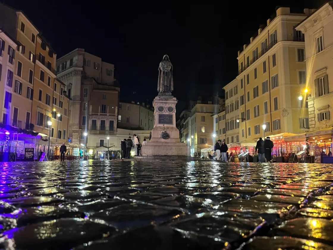 Se Piazza Navona è il salotto buono, Campo de’ Fiori è il resto della casa, sempre in disordine. Navona è barocca, Campo è popolare. La mattina mercato, con i suoi odori che si fanno notare: spezie, frutta e pesce su tutto, che ogni giorno si monta e si smonta; la sera, diventa un locale a cielo aperto, o meglio, una bettola se mi lasci dire: qui studenti e turisti si mischiano e lasciano, purtroppo troppo spesso, un “quasi letamaio”. Per fortuna, la piazza viene pulita due volte al giorno la mattina presto e dopo il mercato. Tutto accade sotto la supervisione silenziosa e austera della statua Giordano Bruno: cappuccio calato, sguardo severo. Qui non si scherza: il filosofo arso vivo a Campo nel 1600 non è solo un monumento, è un monito, oltre ad essere l’eroe della laicità romana.