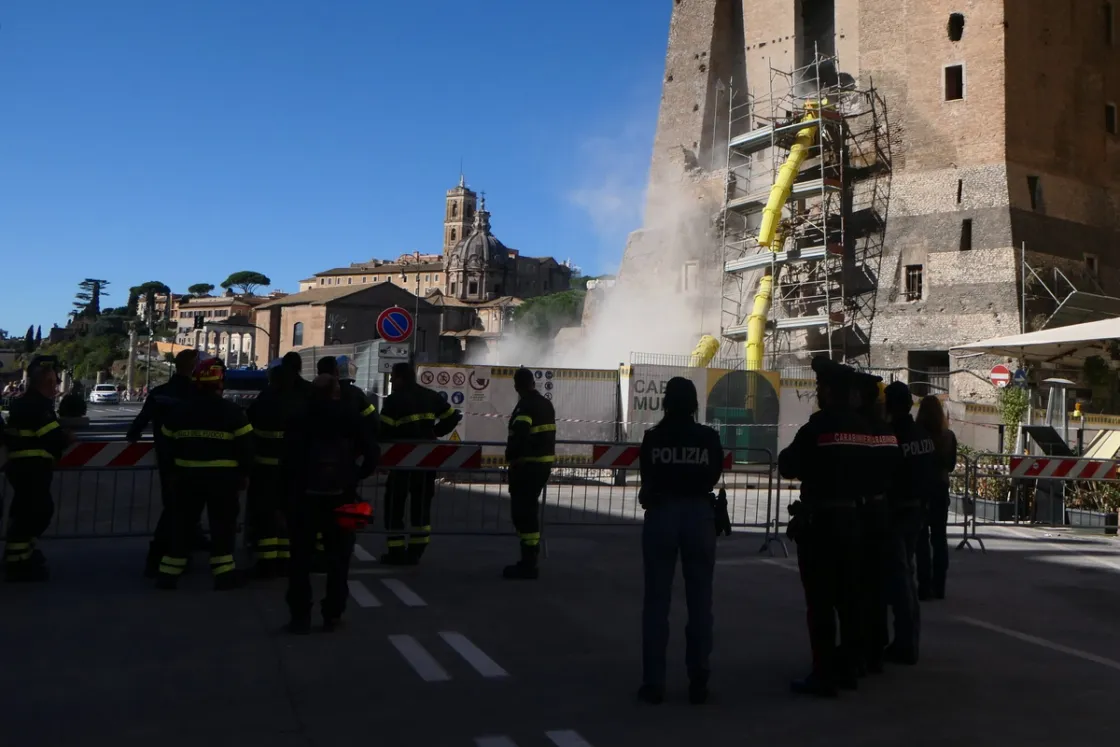 L'area intorno alla Torre è da ieri ormai transennata e presidiata da polizia, carabinieri e vigili del fuoco per evitare l’avvicinamento dei passanti e dei turisti. E questa mattina si sono sono verificate altre piccole cadute di detriti e calcinacci dopo il doppio crollo di ieri, che hanno provocato una nube di polvere a largo Corrado Ricci, all’incrocio tra via dei Fori Imperiali e via Cavour.