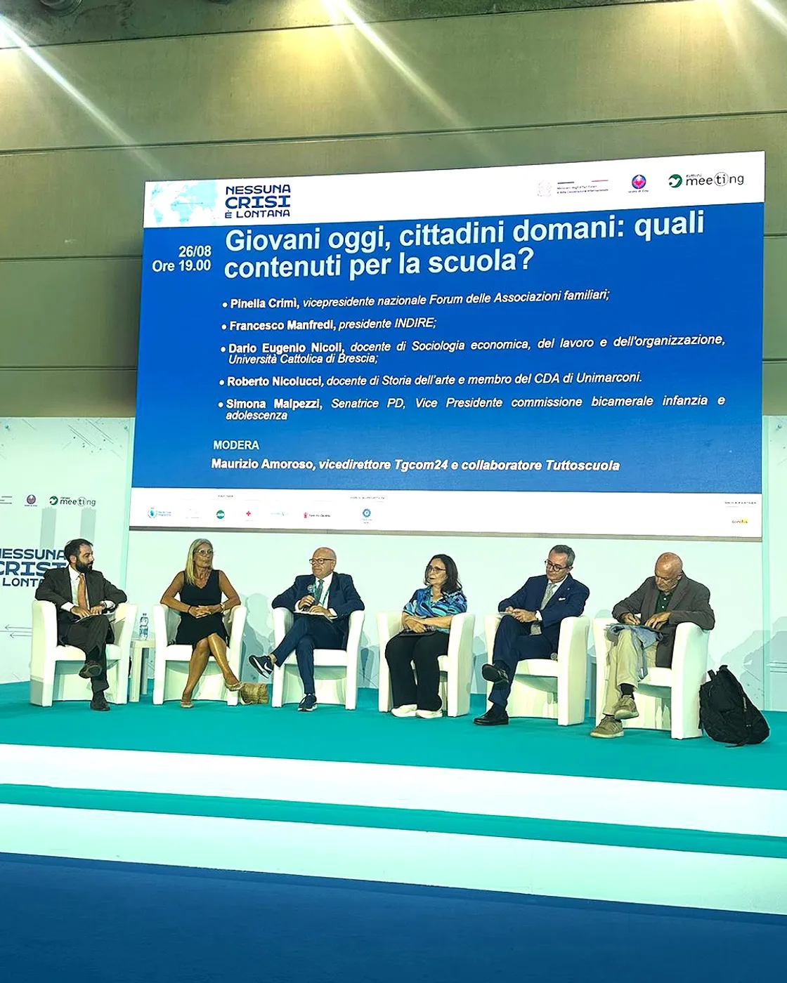 Il Meeting di Rimini 2025, sotto il titolo Nei luoghi deserti costruiremo con mattoni nuovi, ha confermato ancora una volta di essere un luogo privilegiato di dialogo tra istituzioni, società civile, accademia e mondo della scuola. Tra i numerosi incontri, il panel Giovani oggi, cittadini domani: quali contenuti per la scuola, moderato da Maurizio Amoroso, vicedirettore di TGcom24, ha messo a confronto esperienze e prospettive su come accompagnare le nuove generazioni in una fase storica caratterizzata da profondi mutamenti culturali, sociali e tecnologici.