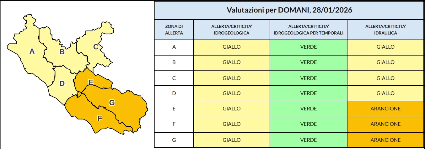 Per la giornata di oggi è indicata allerta gialla per criticità idrogeologica su tutte le zone di allerta del Lazio. Il quadro si differenzia per il rischio idraulico: livello giallo sui bacini costieri del Nord (A), bacino medio del Tevere (B), Appennino di Rieti (C) e bacini di Roma (D); livello arancione invece nelle aree più meridionali e interne, corrispondenti alle zone Aniene (E), bacini costieri del Sud (F) e bacino del Liri (G), dove la criticità è valutata moderata.
