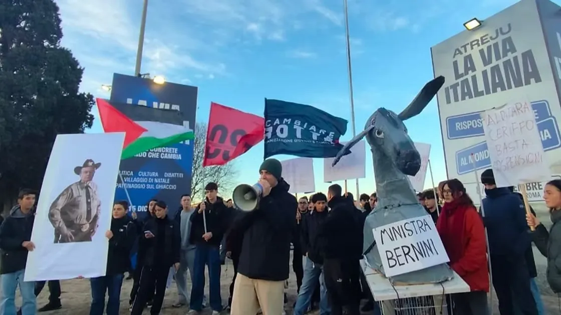 Con loro un cartello con l’immagine del ministro dell’Istruzione Giuseppe Valditara vestito da sceriffo e un asino di cartone con il nome della ministra dell’Università Anna Maria Bernini. «Basta sospensioni», «basta repressione», «ministra somara», «no alla riforma Bernini», si legge sugli striscioni dei manifestanti.