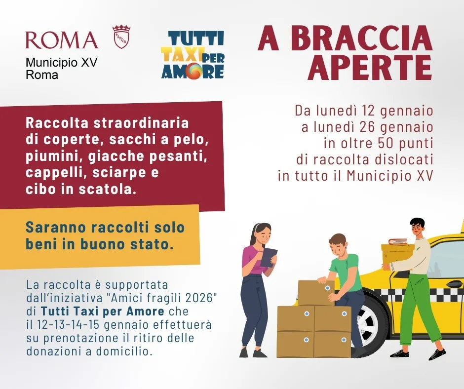 Come hanno fatto sapere il presidente del XV municipio Daniele Torquati e l’assessora al Sociale Agnese Rollo,«A braccia aperte» incrocia un evento solidale capitolino, «Amici fragili», che - con il sostegno dei tassisti dell’associazione di volontariato «Tutti Taxi per Amore» - consente il ritiro dei prodotti direttamente a casa di chi vuole donarli. Il servizio a domicilio è disponibile da lunedì 12 a giovedì 15 gennaio contattando, dalle 9 alle 13 e dalle 17 alle 20, i numeri 3396059080, 3387157566, e 3338253771