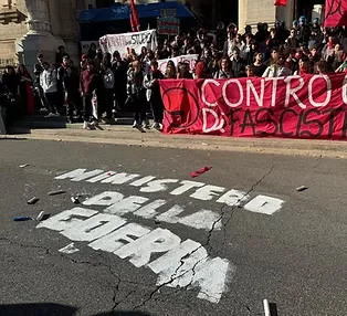 Sull'asfalto, proprio sotto al Miur, si legge una scritta: «Governo della guerra», mentre sventolano le bandiere palestinesi sullo sfondo del ministero.