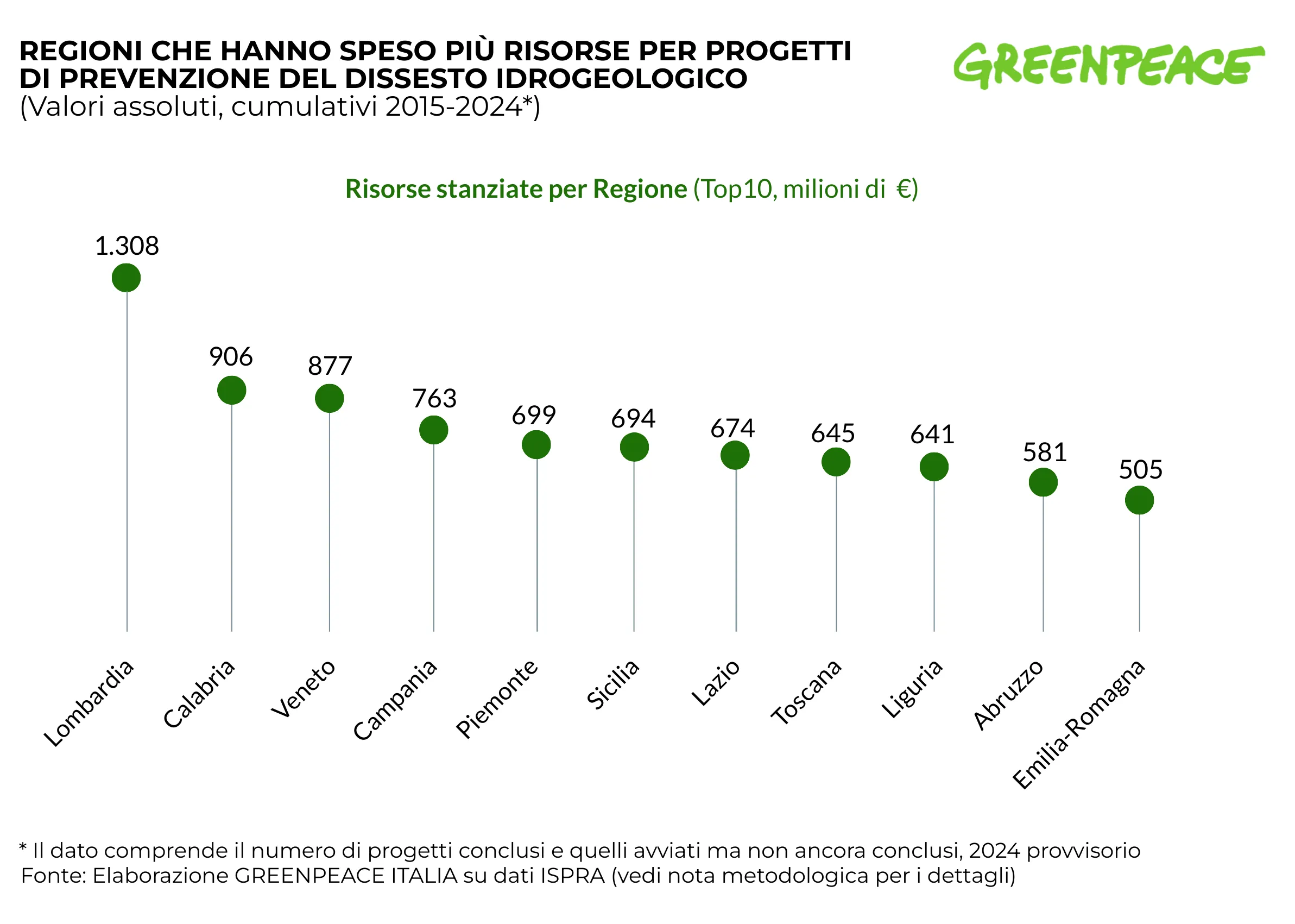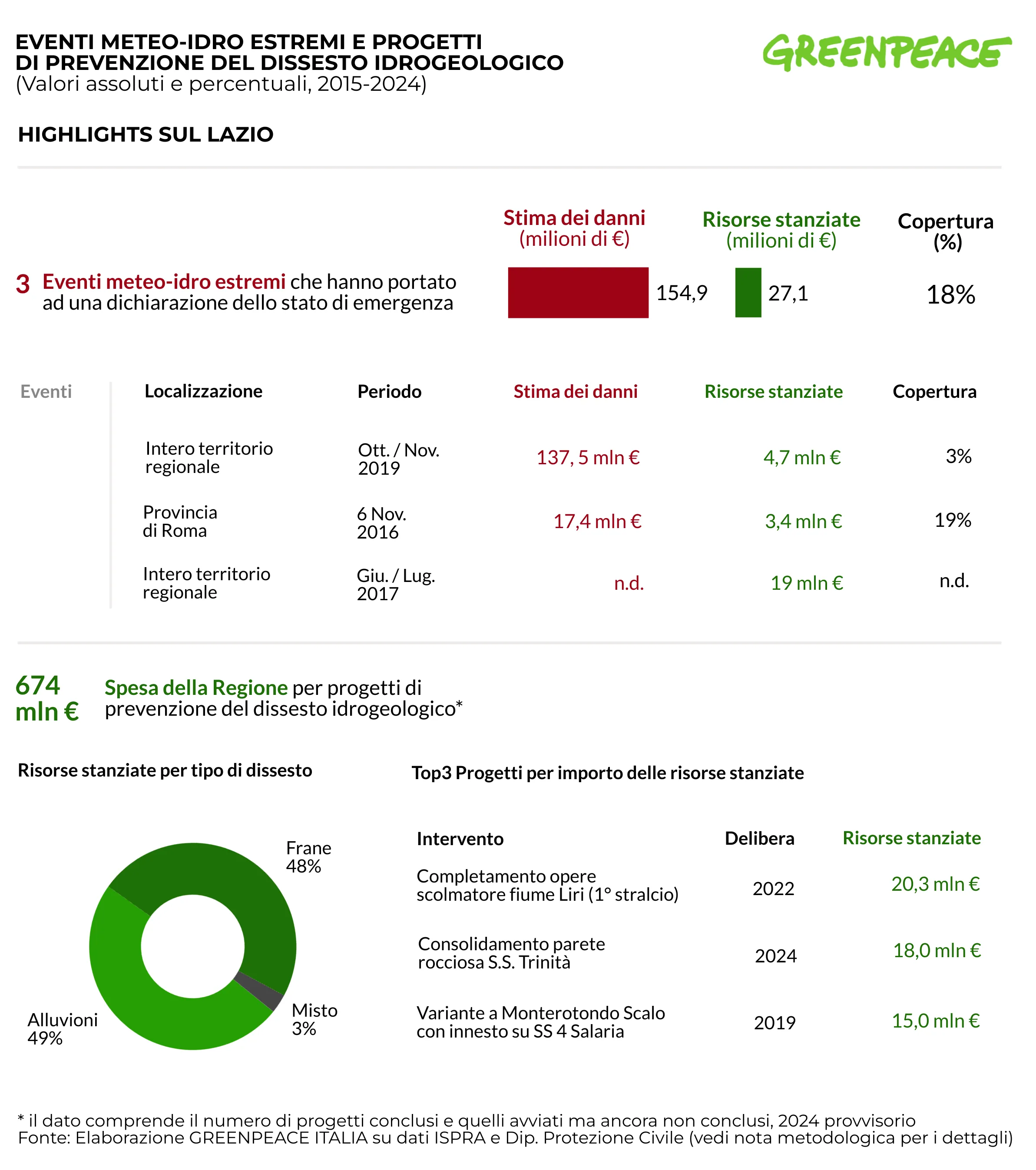 Nel periodo analizzato, il Lazio ha investito 674 milioni di euro in progetti di prevenzione del dissesto idrogeologico, per un totale di 822 interventi. Le risorse si sono concentrate soprattutto su opere contro alluvioni e frane, che rappresentano le principali criticità del territorio.