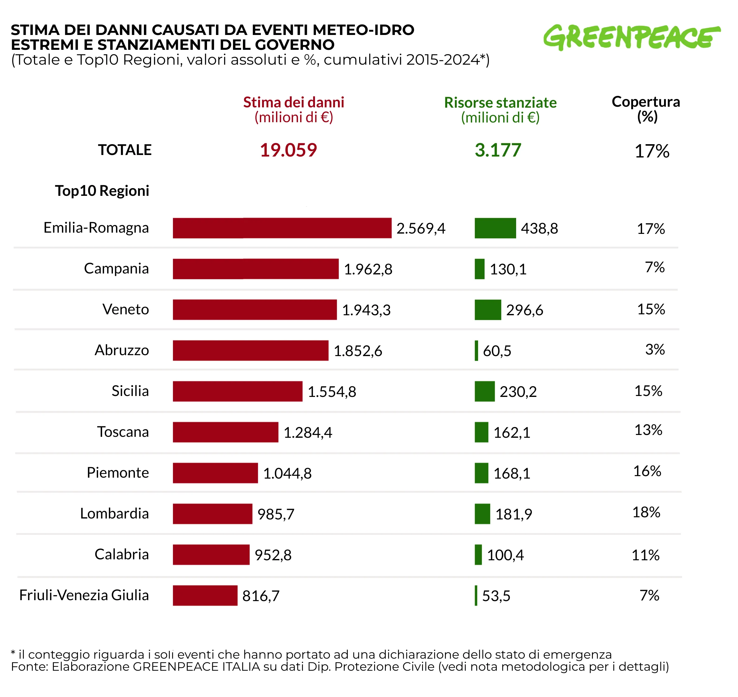 Entrando nel dettaglio, l’evento più rilevante si è verificato tra ottobre e novembre 2019, quando l’intero territorio regionale è stato colpito con danni stimati in 137,5 milioni di euro. In quel caso, le risorse stanziate sono state appena 4,7 milioni, pari al 3% del totale.