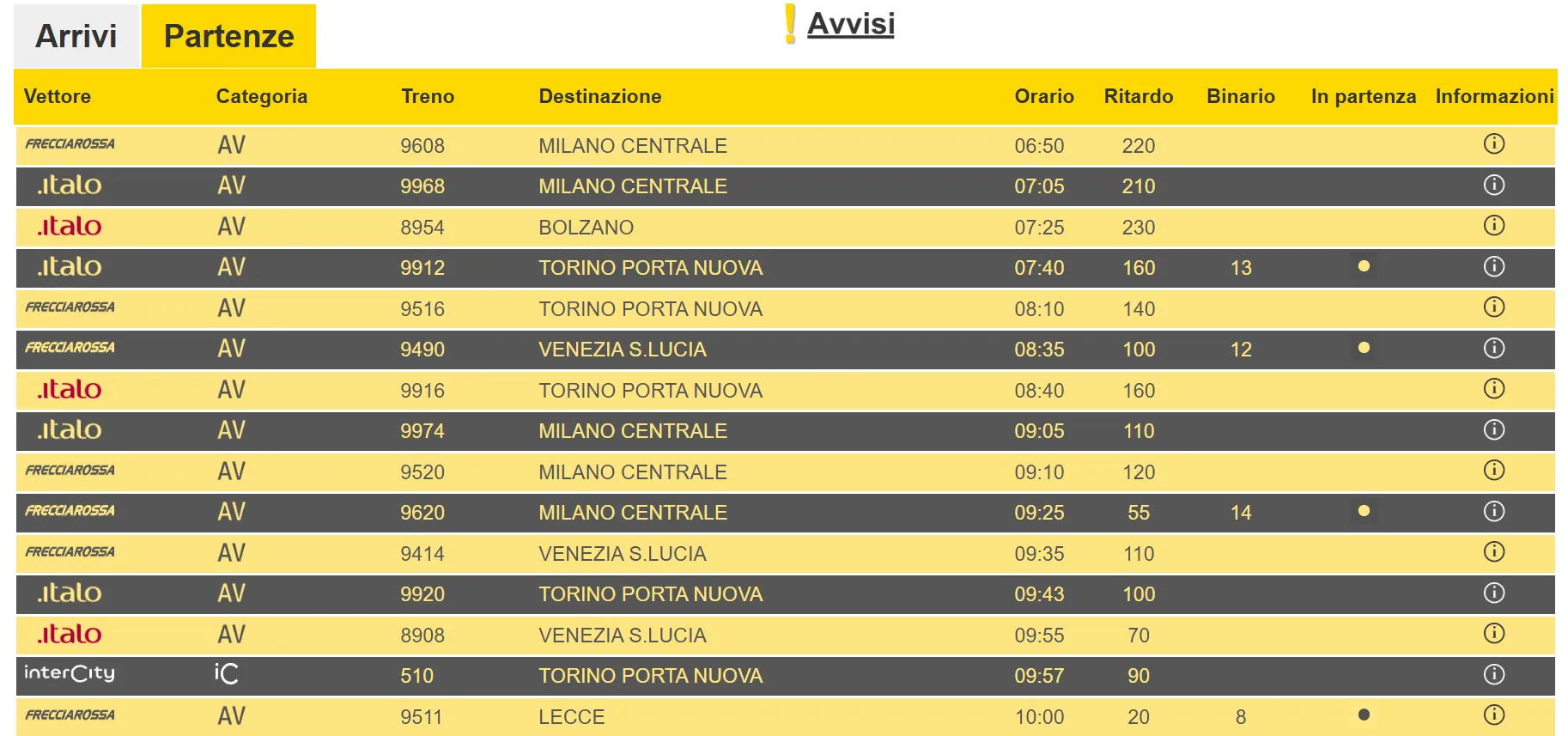 Picchi significativi di ritardo hanno ad esempio colpito i treni diretti a Milano Centrale, con 220 minuti di ritardo (aggiornamento delle 10.20) o per Bolzano, con 230 minuti di ritardo.