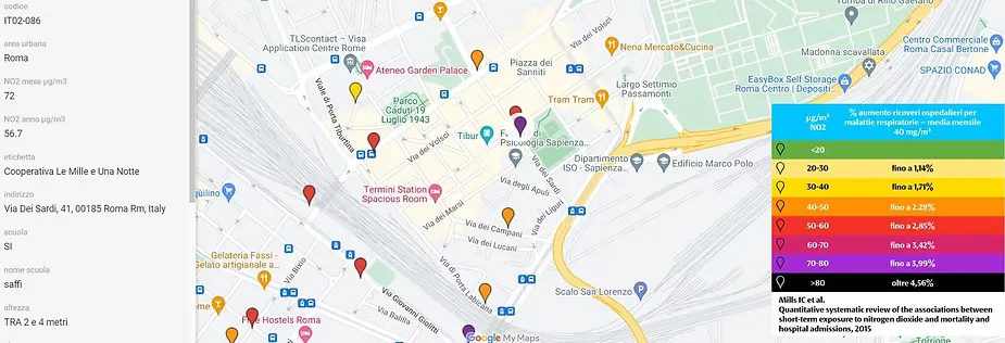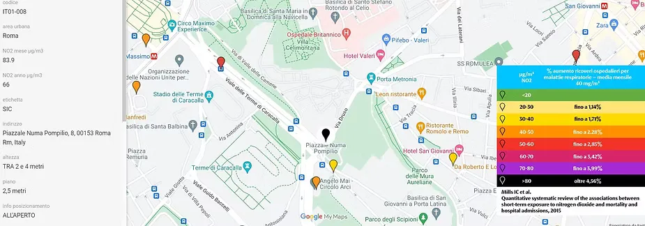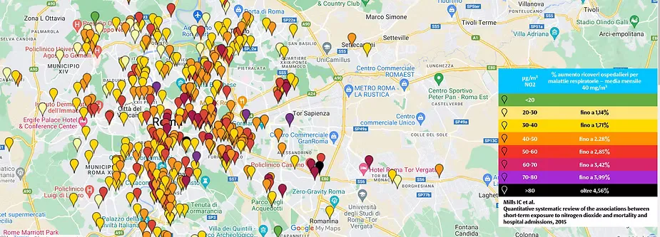 Per il Lazio sono stati posizionati circa 500 campionatori. In particolare a Roma il 99 per cento dei 387 campionatori che rispettano i criteri di inclusione menzionati, ha misurato concentrazioni di biossido di azoto superiori alla soglia annuale di 10 μg/m³che i ricercatori dell’OMS indicano come valore dal quale tenersi lontani, perché valori superiori provocherebbero un impatto sulla salute umana.