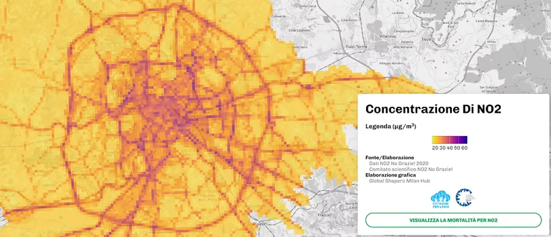 Concentrazioni di NO2 menisili a Roma. Credit: Cittadini per l'aria