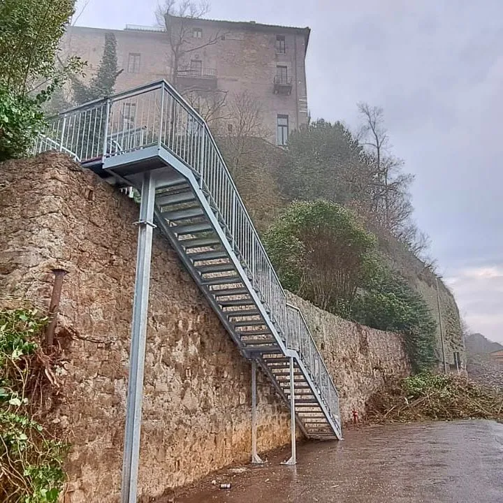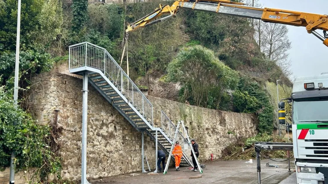 È stata montata ed è già percorribile la scala in ferro per il collegamento pedonale al borgo di Isola Farnese, immediatamente fruibile dagli abitanti.