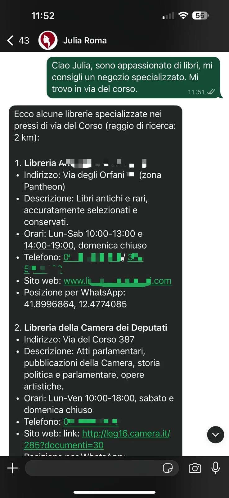 Grazie alla sua presenza omnicanale su WhatsApp, Messenger, Telegram e Web Chat, Julia è in grado di rispondere in tempo reale alle domande, suggerendo itinerari personalizzati e accompagnando turisti e residenti alla scoperta di Roma in modo semplice e immediato. Attiva 24 ore su 24, 7 giorni su 7, Julia parla oltre 80 lingue e fornisce informazioni sempre aggiornate su esercizi, eventi, mostre, trasporti pubblici, eventuali allerte della Protezione Civile e tempi di attesa nei pronto soccorso.