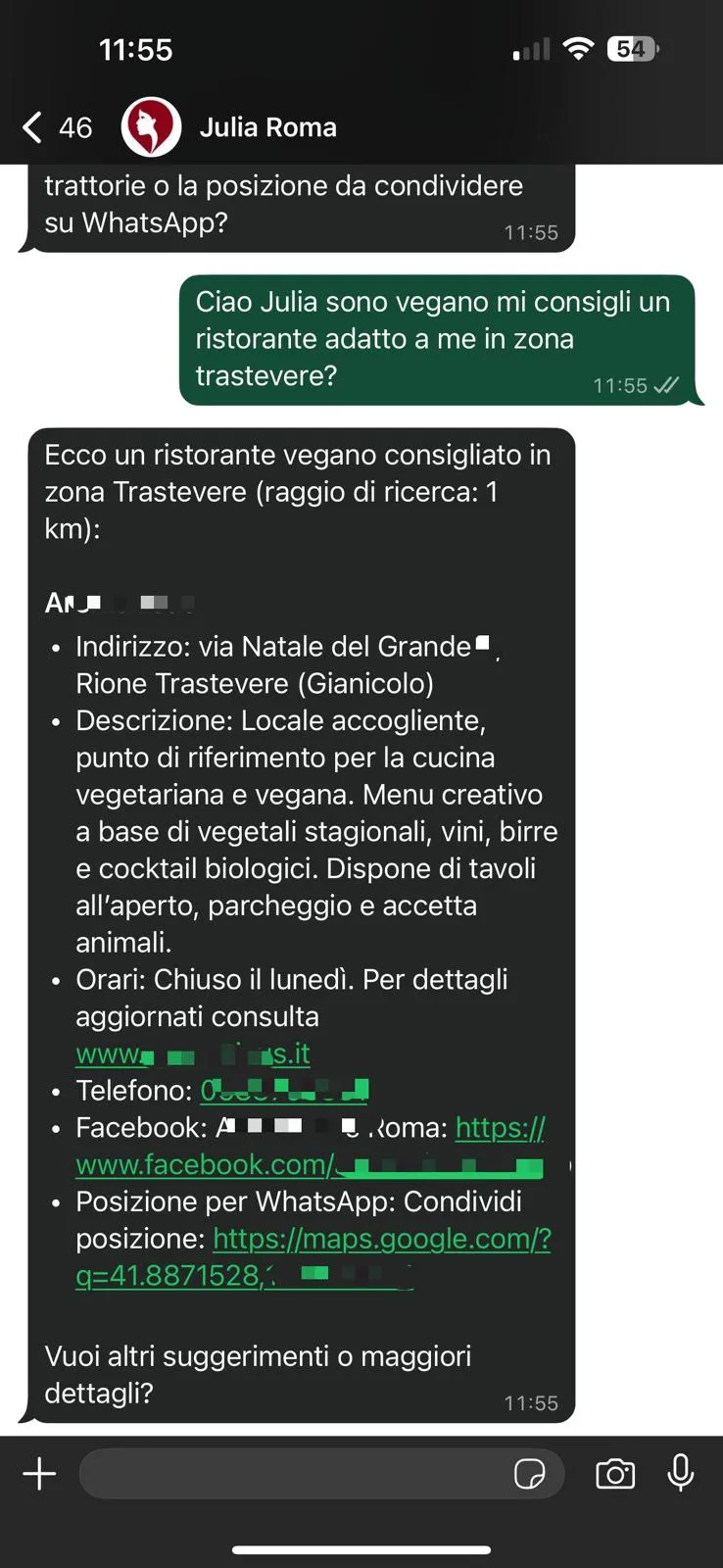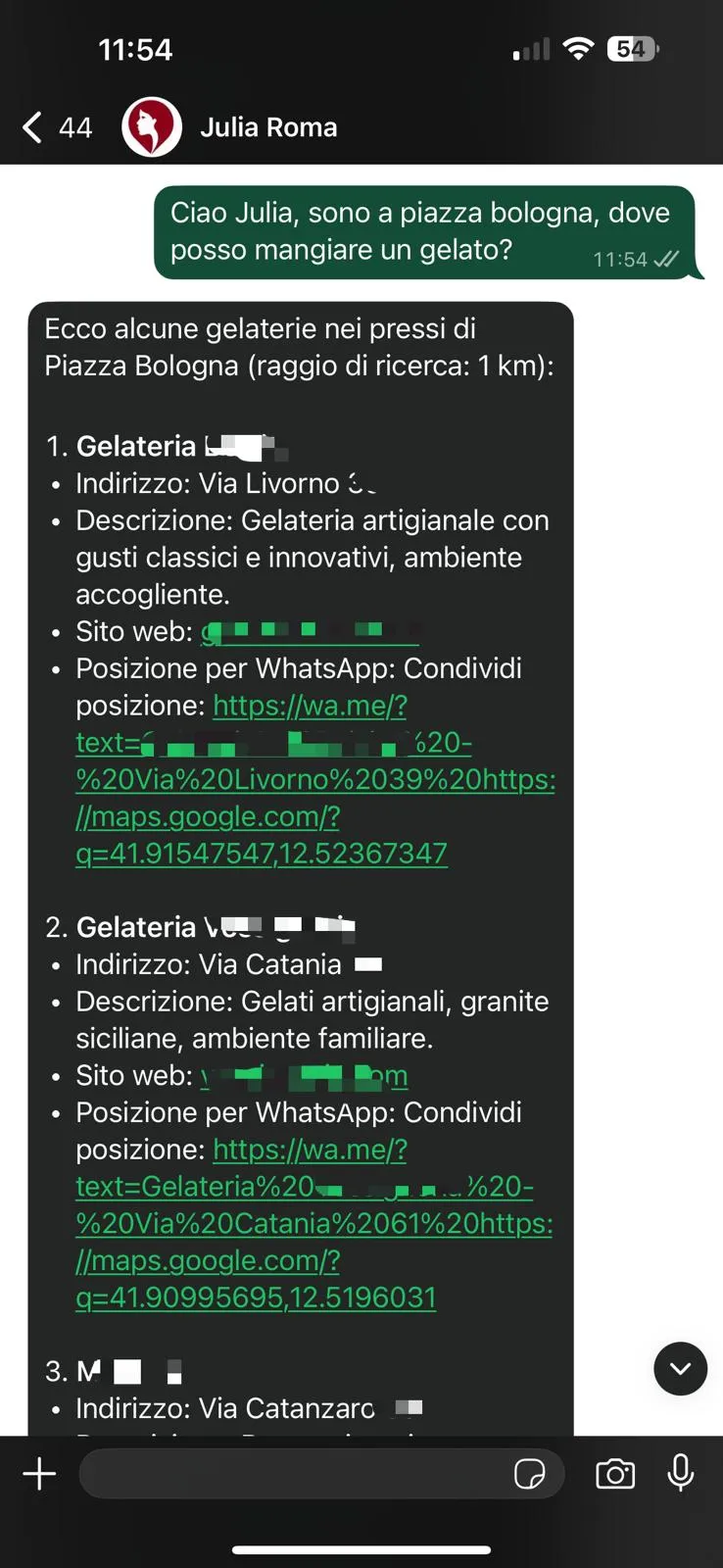 Julia permette all’utente di condividere volontariamente la propria posizione geografica, così da offrire suggerimenti personalizzati su dove mangiare, soggiornare, fare acquisti e su cosa visitare nei dintorni, adattando le proposte alle preferenze dell’utente e alla zona in cui si trova. Julia crea esperienze e indirizza gli utenti verso le attività registrate nel portale, anche in fase di pianificazione del viaggio.