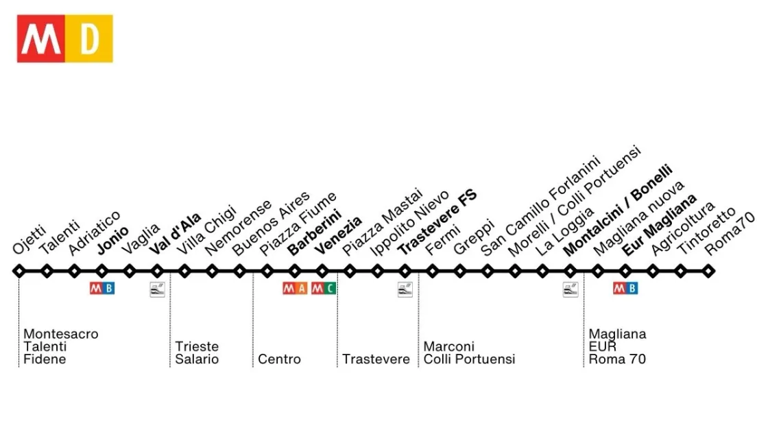 Il percorso della Metro D si sviluppa lungo un asse nord-sud che attraversa diversi quadranti della città. Il capolinea settentrionale è collocato oltre il Grande raccordo anulare, lungo la Nomentana.
