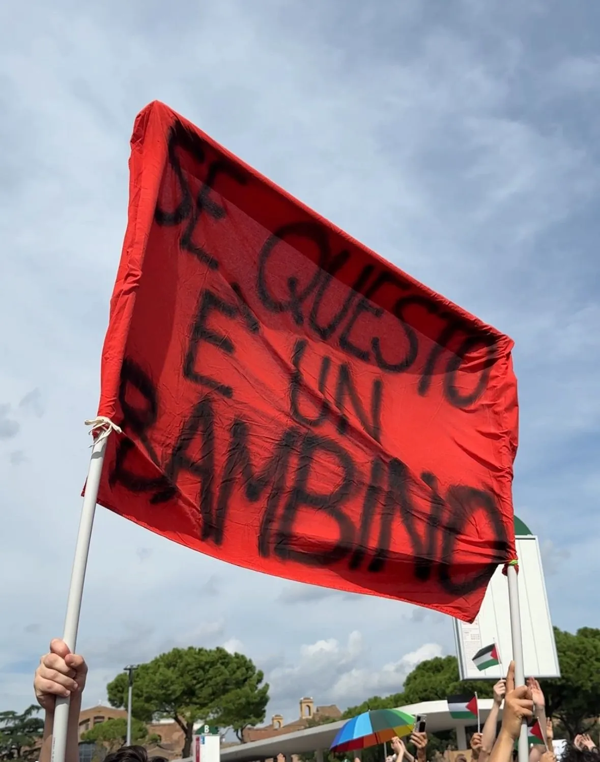 La piazza è colorata da striscioni e cori per una Palestina libera, accompagnati da slogan contro Israele e il governo italiano. Numerosi anche i riferimenti alle recenti dichiarazioni di Eyal Mizrahi, presidente della federazione Amici d’Israele durante un dibattito sulle vittime della guerra.