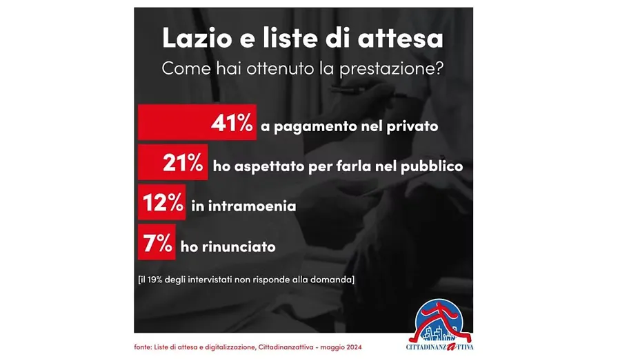 Soltanto uno su due, il 51,2%, dichiara di aver ottenuto l'appuntamento richiesto nei tempi previsti dalla impegnativa, nove su dieci ritengono che i tempi di attesa nel Lazio non siano compatibili con le proprie esigenze di salute e oltre il 37% pensa che la situazione sia ulteriormente peggiorata negli anni.