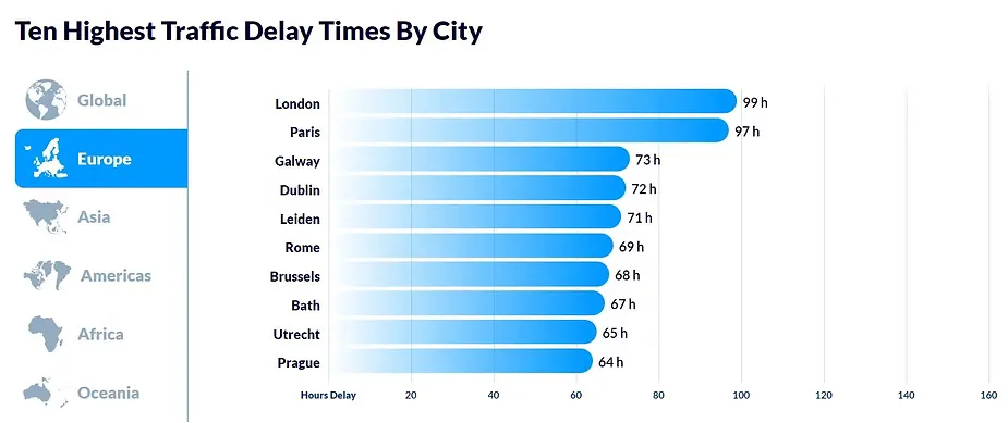 La numero uno del 2023, Londra, e la numero due, Parigi, hanno conquistato anche quest'anno i primi posti nella classifica europea, con i conducenti che hanno perso rispettivamente 99 e 97 ore per strada. Mentre Roma, ancora sul podio e terza in classifica ha fatto perdere ai suoi automobilisti circa 69 ore nel traffico.