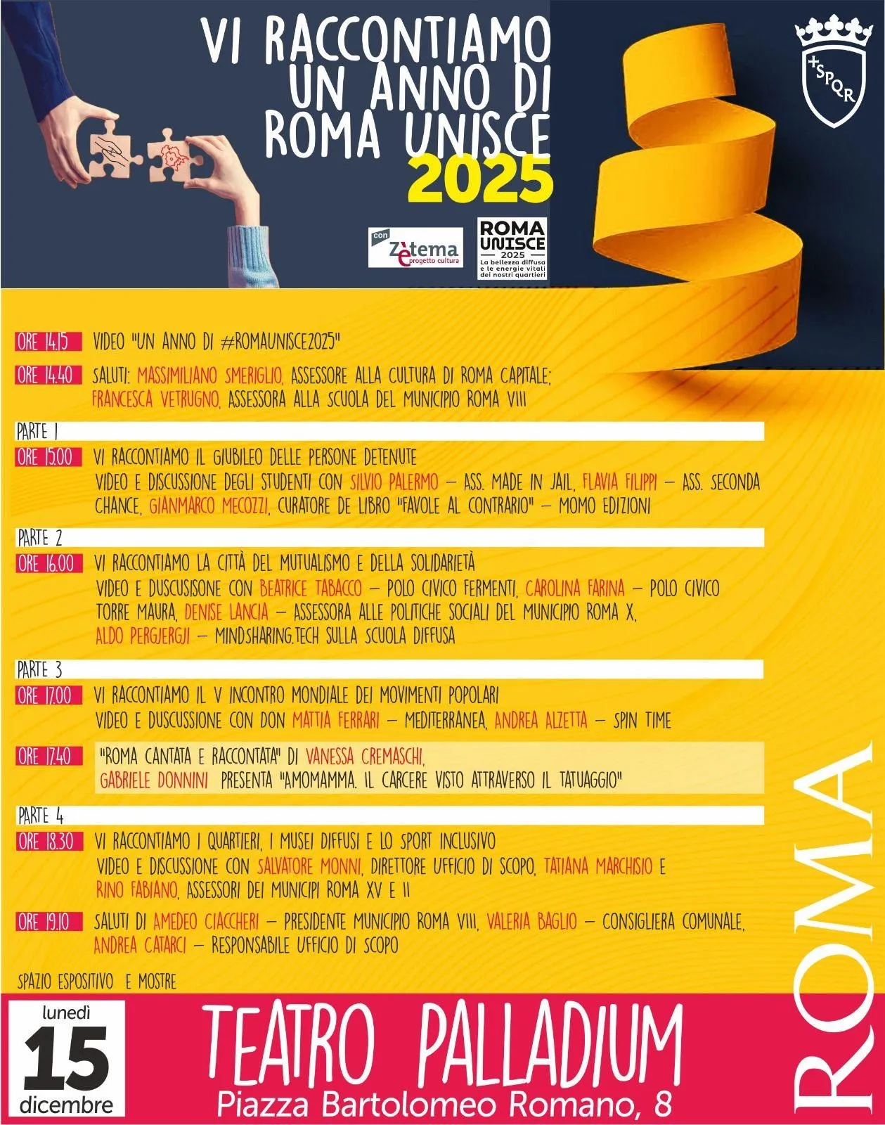 «Con #RomaUnisce2025 abbiamo creato connessioni tra Campidoglio, municipi, associazioni, realtà di base, reti locali e cittadinanza nell'anno del Giubileo, trasformandolo non solo in un tempo di opere e grandi eventi, ma in un’occasione per consolidare coesione, solidarietà e mutualismo», ha commentato Andrea Catarci, responsabile dell’ufficio di scopo Giubileo delle persone e partecipazione, promotore di Roma Unisce 2025.